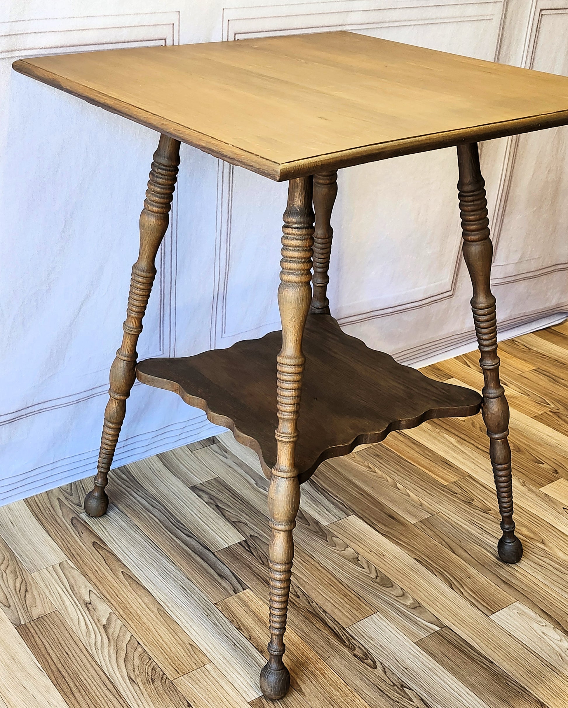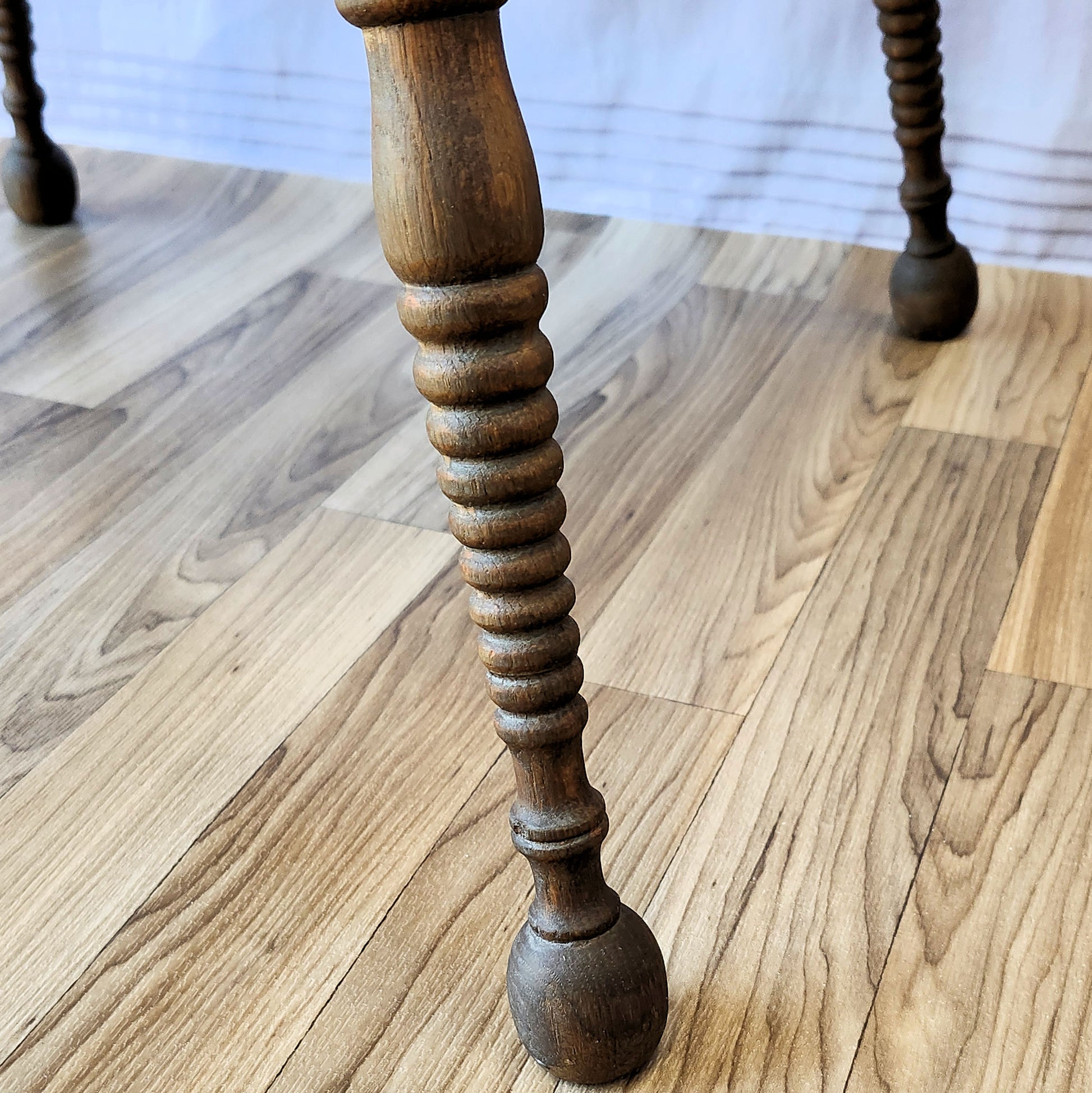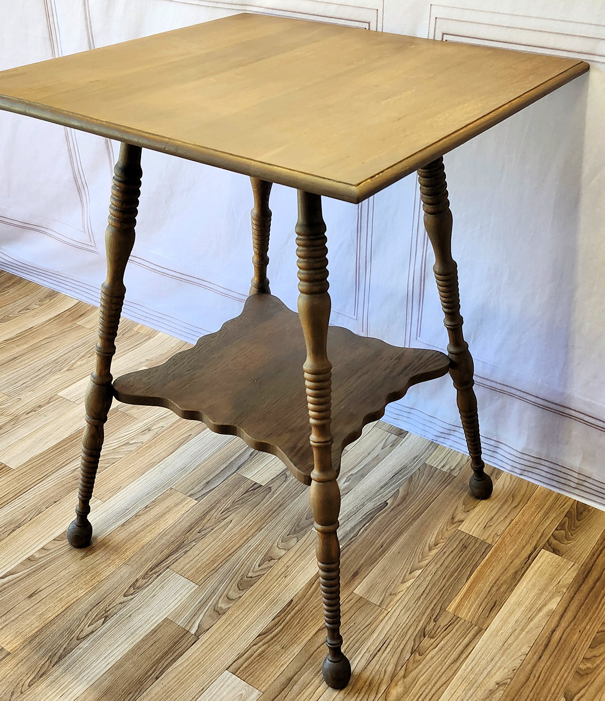 Step into the elegance of the early 1900s with this beautifully refinished antique oak parlor table. Its carefully crafted lower shelf with detailed cut edges and graceful spindle legs atop ball feet bring classic style to any space. Finished in a rich brown hue using milk paint as a stain, this table is expertly sealed with furniture oil and wax to protect its stunning look for years. Make this timeless piece a centerpiece in your home today.